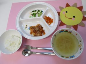 ★幼児食★ ・ご飯 ・みそ汁 ・スパゲッティ野菜 ・生姜焼き ・みかん缶 ★離乳食★中期食 ・おかゆ...