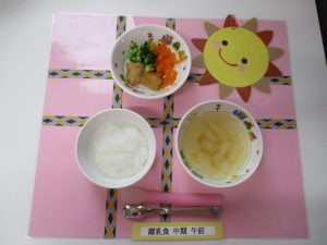 2018.11.20|給食ピックアップ 11月20日(火)お給食 ★幼児食★ ・ご飯 ・味噌汁 ・かじきの竜田揚げ ・ごぼうサラダ ・ブロッコリーの塩茹で ★離乳食★中期食 ・おかゆ ・味噌汁 ・煮魚 ・茹で人参 ・茹でブロッコリー 前へ 次へ