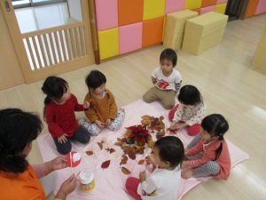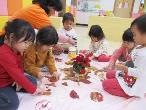 お散歩の時に集めた落ち葉を使って、ポインセチアを作りました( ◠‿◠ )