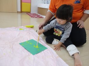 筆を持って絵の具を『チョン、チョン、チョン』(^^♪