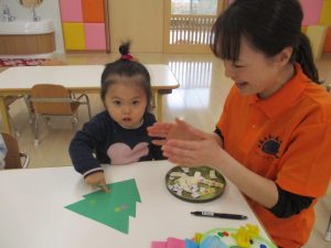 もみの木にシールをペタ、ペタ、ペタ!!