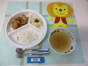 ★幼児食★ ・ご飯 ・味噌汁 ・中華風ローストチキン ・マカロニサラダ ・おかか和え ★離乳食☆後期...