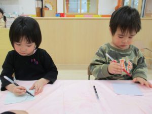 いちご組のおともだちは、ペンでお絵かきです(・∇・)/![]()