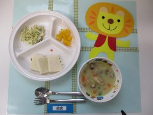 ★幼児食★ ・食パン ・チキンクリームシチュー ・混ぜ混ぜサラダ ・チーズ ・ももの缶詰