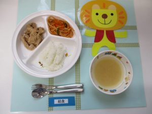 ★幼児食★ ・ご飯 ・味噌汁 ・しょうが焼き ・スパゲティーソテー野菜