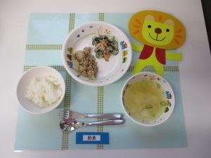 ★幼児食★ ・ご飯 ・味噌汁 ・鶏肉のすき焼き風煮 ・おかか和え ・みかん缶