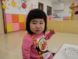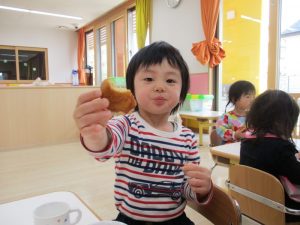 この日のおやつは、手作りきなこドーナツです子どもたちの表情で、とても美味しいおやつなのが分かりますよね![]()
