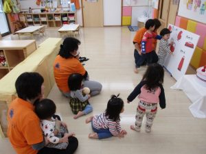 お誕生会では、子どもたちが大好きな絵本【だるまさんが】のパネルシアターで盛り上がりました