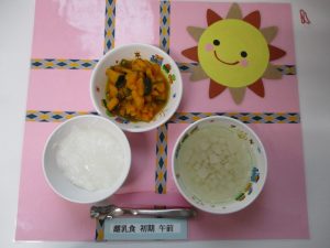 2019.05.28|給食ピックアップ 5月28日(火)お給食 ★幼児食★ ・ご飯 ・味噌汁 ・鮭の香りみそ焼き ・野菜炒め ・かぼちゃの甘辛煮 ★離乳食☆初期★ ・おかゆ ・茹でかぼちゃ ・大根入りカツオ出汁 前へ 次へ