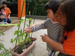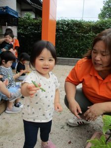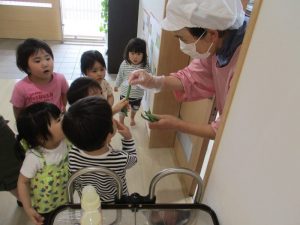 収穫したインゲン豆は、調理員の先生のもとへ・・・![]()