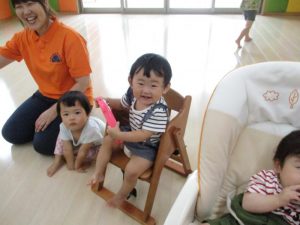 もも組のお友だちにも、いちご組とりんご組のお兄さんお姉さんが果物を運んで来てくれましたよ![]()