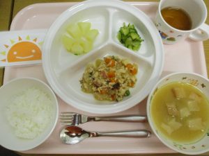 ③鍋を熱し、油を入れ、ベーコン→にんじん→たまねぎ→しいたけの順に入れ弱火で炒める。(5秒おきに入れていく間隔)