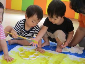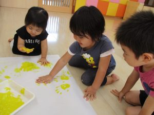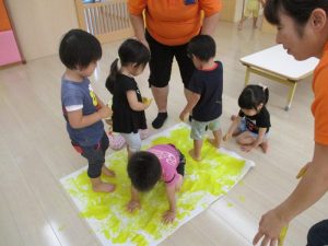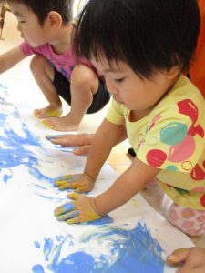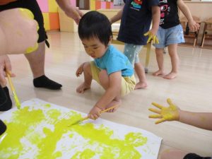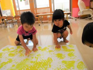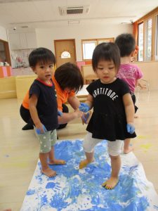模造紙の上からはみ出して、絵の具の付いた足で保育室を歩く子ども達![]()