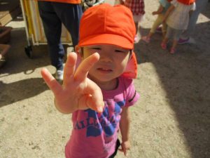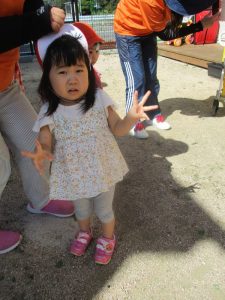 との保育士の言葉に、てんとう虫さんを飛ばしてあげようと、フワッと手をあげたりんご組のお友だち![]()