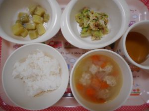 ご飯 肉団子スープ まぜまぜサラダ さつま芋の甘煮