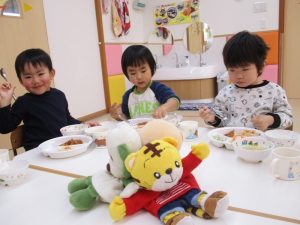 テーブルの真ん中では、子どもたちの大好きなアンパンマンやしまじろうが、食欲旺盛な子どもたちの様子を見てくれていましたよ![]()