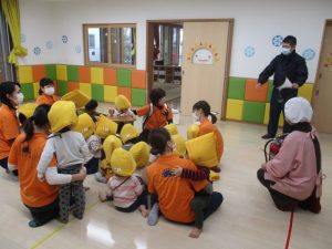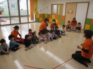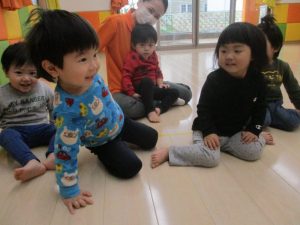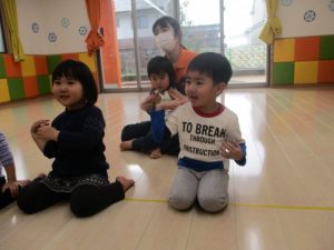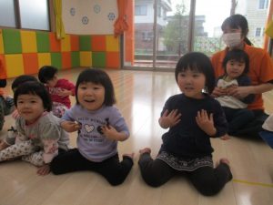 保育士が体の部位を言うと、みんなが楽しそうに体に手を当てていて、とても微笑ましい光景でした![]()