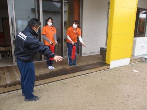 最後に、先生たちが実際に消火器(訓練用)を使って練習を行いました![]()