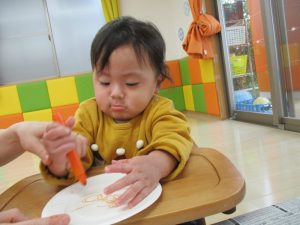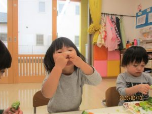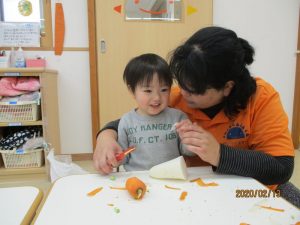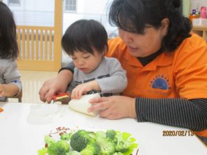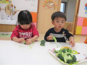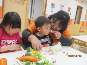 前回は野菜を使ってスタンプ遊びをしましたが、今回は野菜の調理をしてみましたよ