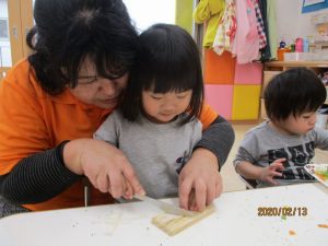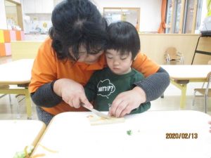 初めて調理器具を扱うので、先生からは『先生と一緒にやろうね』『ここ(刃)を触ったら痛いからね』と話を聞いてから始めました