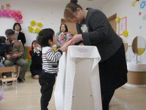卒園証書と記念品を受け取り、そして?もも組と?いちご組のお友だちからのペンダントのプレゼントをかけてもらいましたよ![]()