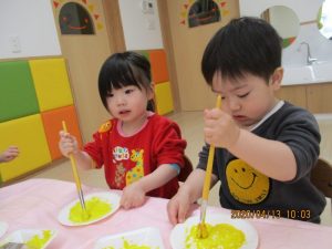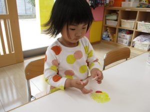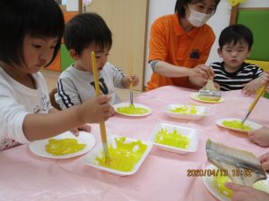 この後、黄色く塗ったお皿に、赤の絵の具をのせました?