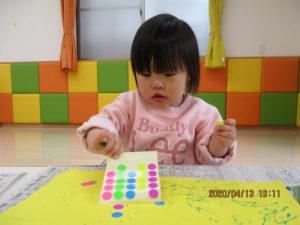 紙のお皿に、絵筆で絵の具をペタペタ・・・![]()