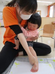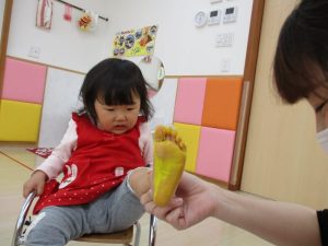 お次は、可愛い足に絵の具を塗って、足型をペタッ![]()