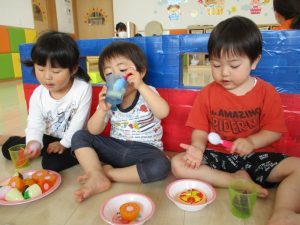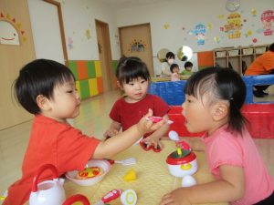 室内遊びでは、みんなが大好きな《おままごと》で、ホッコリする仲良し場面が見られましたよ![]()