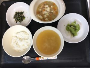 ご飯 味噌汁 生揚げの野菜あんかけ煮 小松菜のおかか和え キウイ