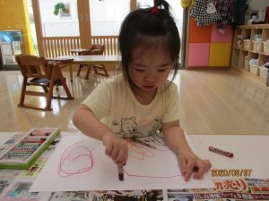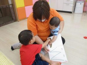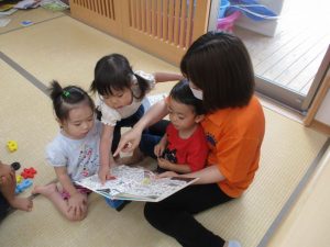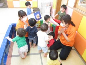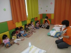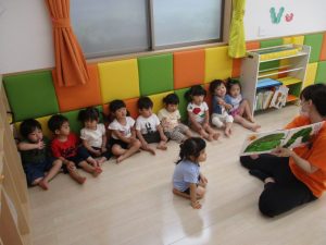 とても有名な絵本《はらぺこあおむし》?を、先生がうたを歌いながら読み聞かせをしてくれました