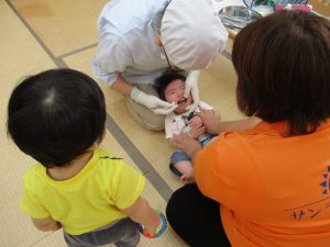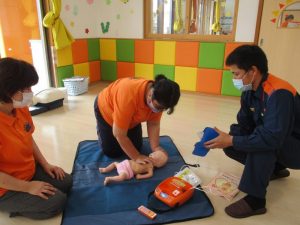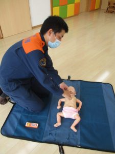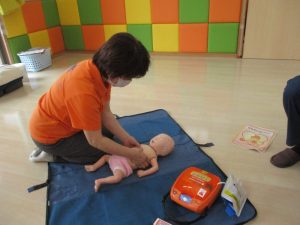 0歳児~2歳児をお預かりする現場なので、乳児の人形での訓練も行いました