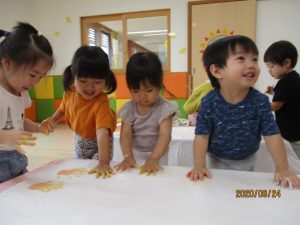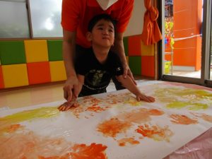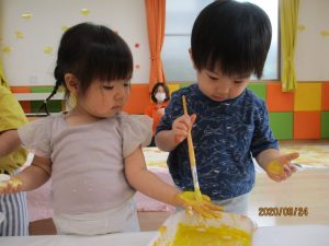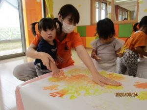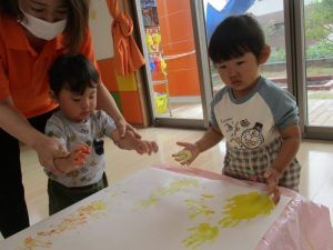 黄色とオレンジの絵の具を使って、大きな模造紙に手形をたくさん付けました