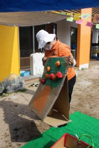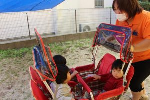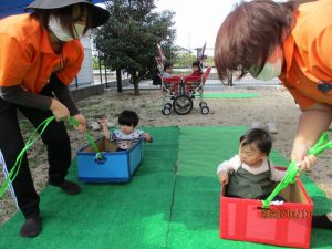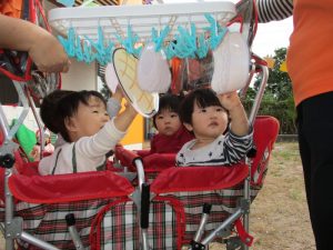もも組の子どもたちがカゴに乗って、先生に引っ張ってもらって果物を見つけに行きます??