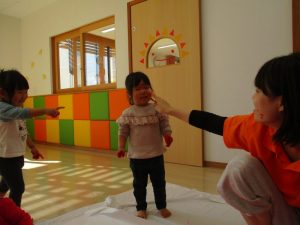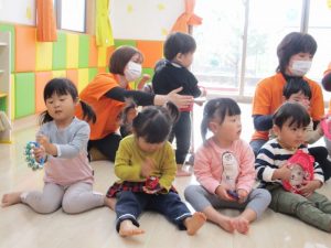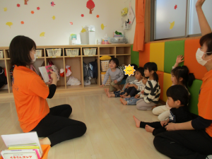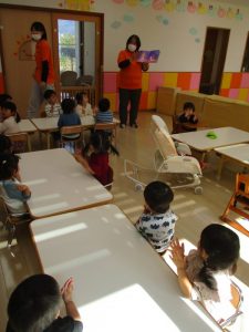 絵本を読んでもらいながら、元気に手をあげたり楽しんでいる様子が伺えますね![]()