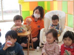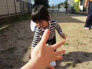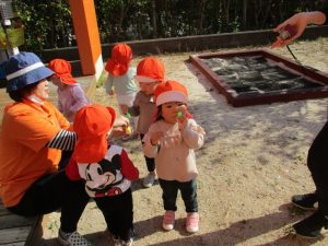 一緒に園庭で遊んでいたもも組のお友だちが、飛んできたシャボン玉に手を伸ばして遊んでいました![]()