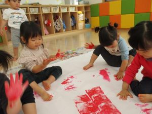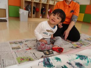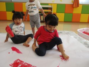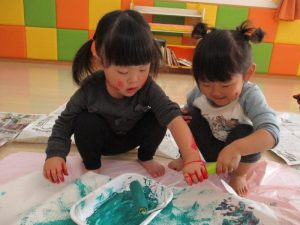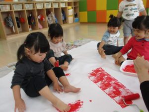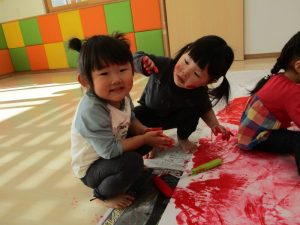 赤と緑でい~っぱいペタペタ色を付けた模造紙は、さて何になるでしょうか~![]()
