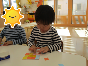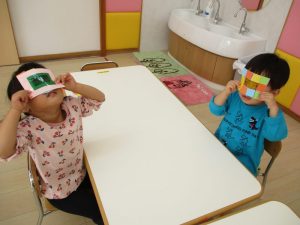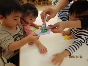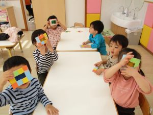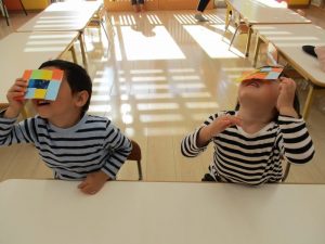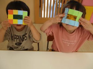 セロハンの色がテーブル映し出され、子どもたちはその光をつかまえようとしていましたよ![]()