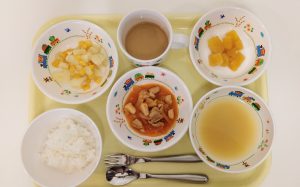 ご飯 味噌汁 若鶏のケチャップ煮 ツナポテ煮 キウイ