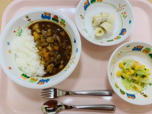 ご飯 チキンのハヤシシチュー コールスローサラダ バナナ