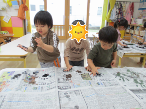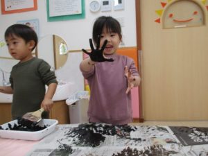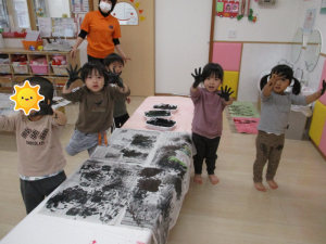 両手を真っ黒にして、ペタペタ![]()