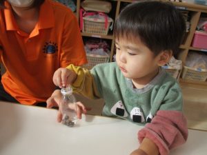 小さなペットボトルで作ったので、ペットボトルの口が小さかったのですが、上手にどんぐりを入れる事が出来ていましたよ✨