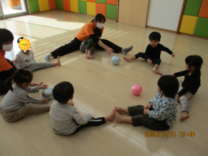 仲良く輪になって、ボール転がしや・・・