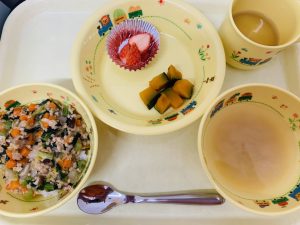 粥 味噌汁 鶏ひき肉と野菜の煮物 かぼちゃの甘煮 いちご
