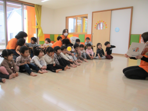 今週は、サンライズキッズ保育園の本部から届いた絵本の読み聞かせをしましたよ
