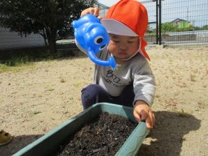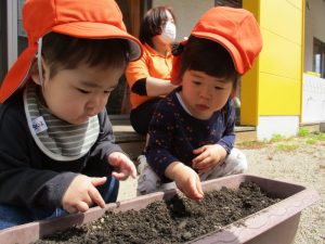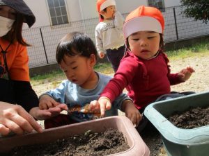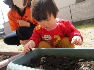 小さなお友だちも外に出て、みんなと一緒に菜園活動に参加しました。