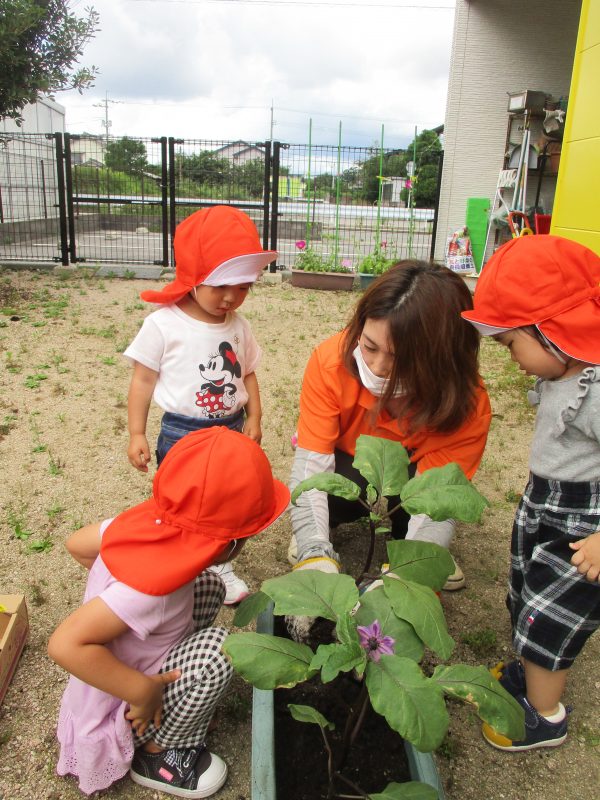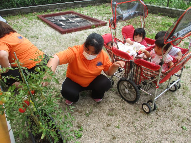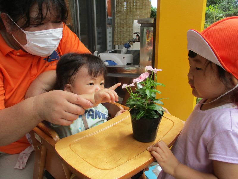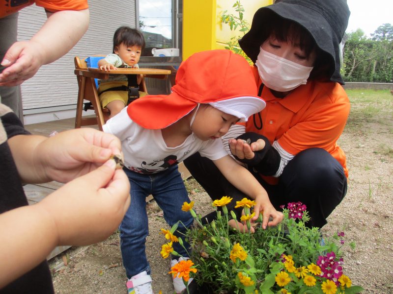 先生と一緒に苗を持ってプランターに植えたり、テラスから見ていたもも組のお友だちに苗を植え見せに来てくれたり。