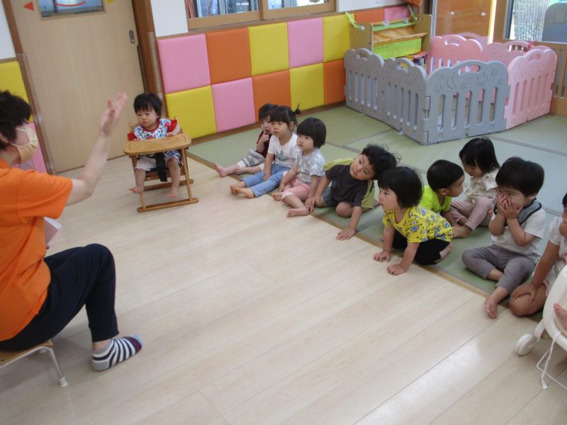 保育士が全員に向けて読み聞かせをする事もあれば、保育士のお膝に座り好きな絵本を読んでもらう