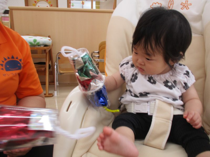 カップに入れたセロファンで遊ぶのも楽しくて笑顔満開✨夢中で遊ぶ姿もみられました。