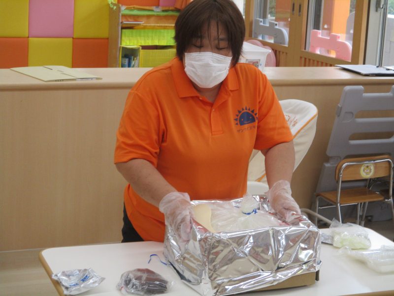 「この中にお湯をいれて15分蒸らすとお米が食べられるようになるんだよ」